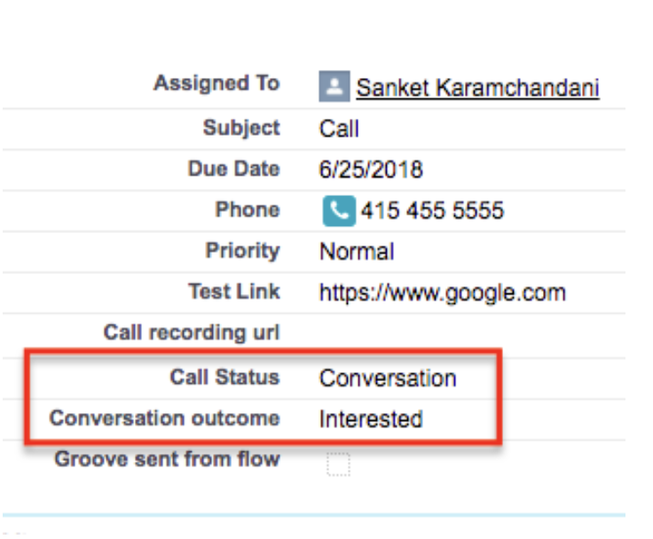 Note: Because Groove will always write the specific conversation outcome picklist value to the Salesforce standard "Call Result" field (API Name: CallDisposition), we do not recommend mapping Call Status to the Salesforce "Call Result" field if you're mapping Call Status and Conversation Outcome to two separate fields.