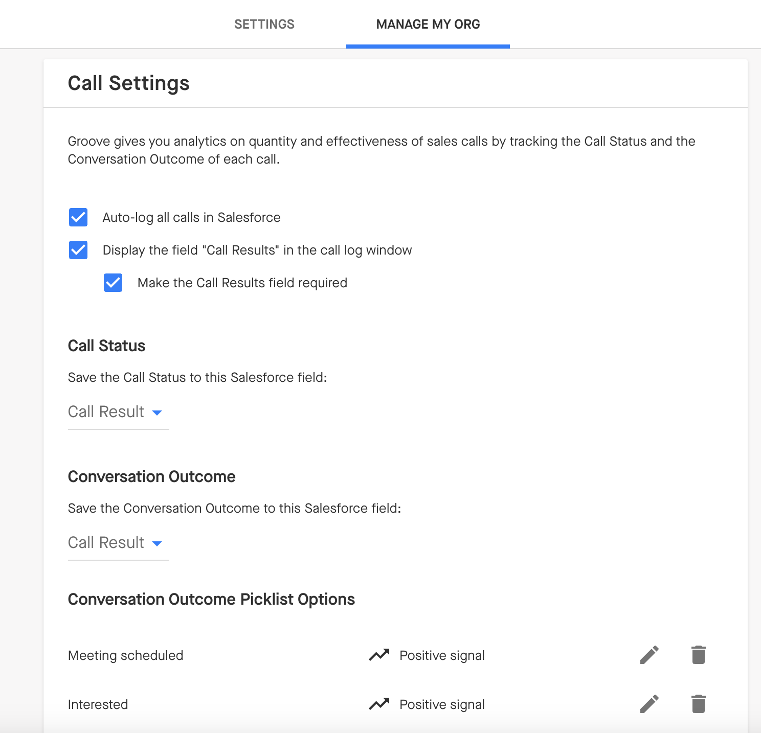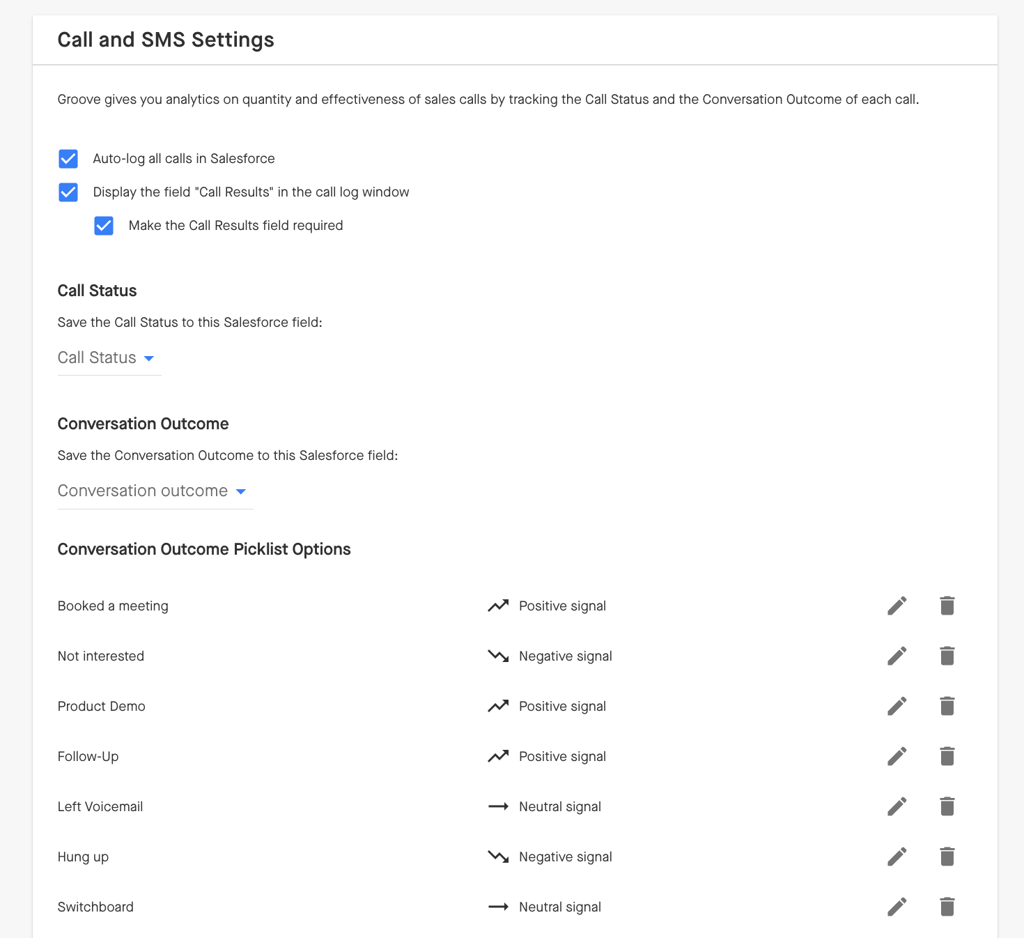 Clari Groove Admin can modify their organization's call settings and choose which Salesforce fields Call Status and Conversation Outcome save to.