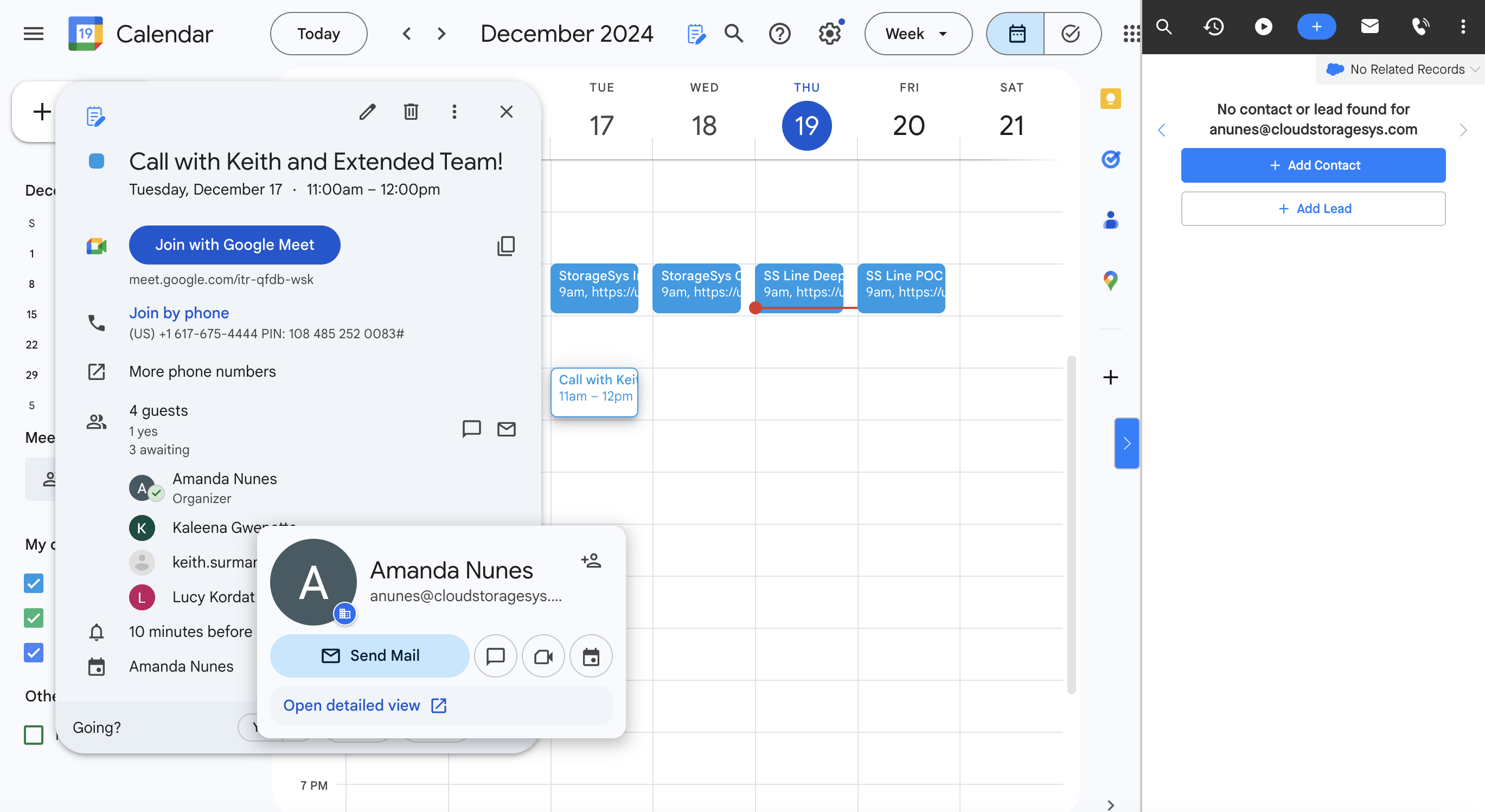 When you're viewing your Google calendar, prepping for a meeting, or inviting prospects/clients to a meeting, you can have all of the Salesforce/LinkedIn context available to you with the Omnibar by hovering over a prospect the same way as Gmail above.